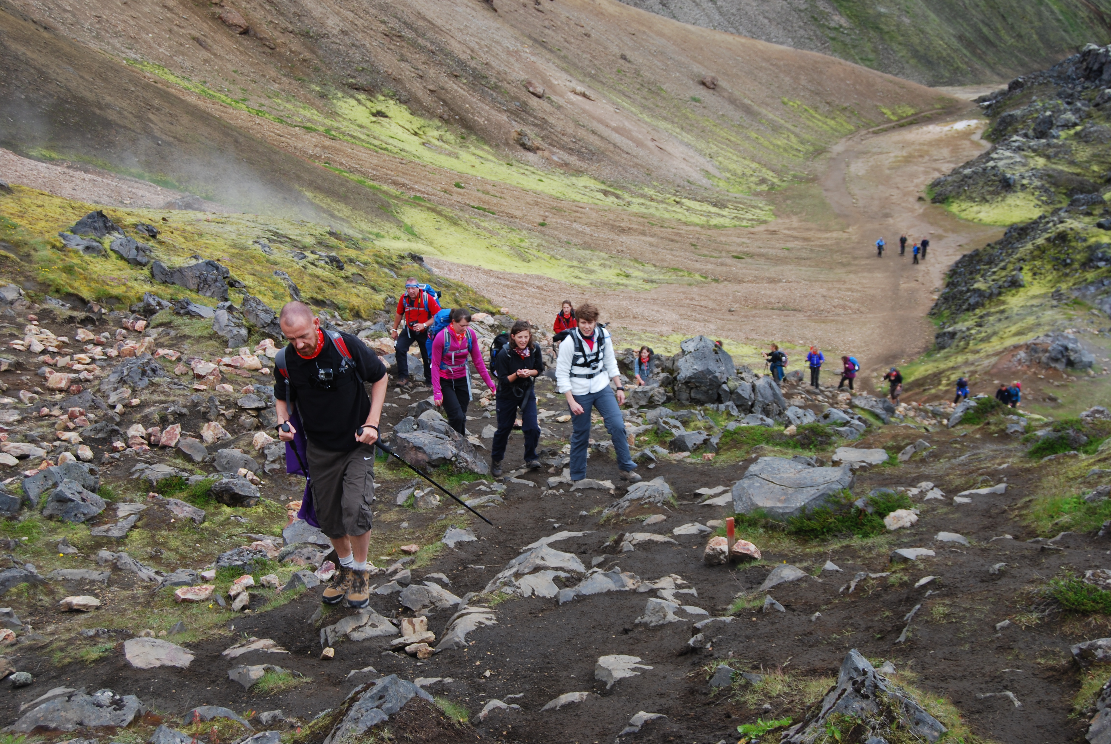 We take our flight to Reykjavik and depending on flights times by mid-afternoon we transfer from the airport to a drop-off point before our campsite. If time permits then the warm up trek climbs hilly ground, crosses rivers and ends on flat terrain before reaching camp. Once settled for the evening we hear more about the days ahead from our guide. It will feel strange going to bed tonight as there is almost 24 hour daylight in summer – black out eye masks are highly recommended! We stay over-night at Landmannahellir campsite.